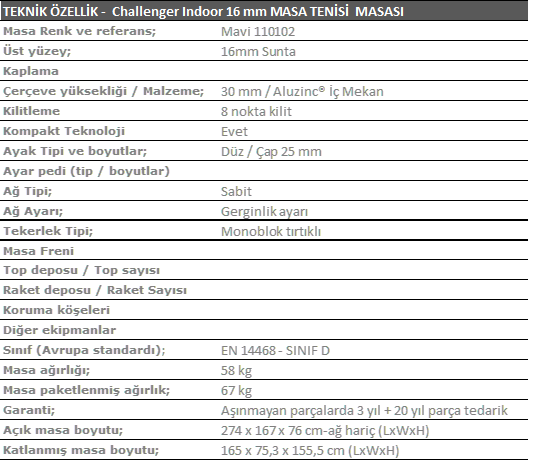 Challenger İç Mekan Masası: Harika Bir Başlangıç İç Mekan Masası Mükemmel oyun kalitesi: 16 mm sunta masa tablası, 30 mm çerçeve Dayanıklılık: 3 yıl garanti, 20 yıl tamir edilebilir Güvenlik: 8 kilitleme noktası Ekipman: Gerilimi ayarlanabilir file